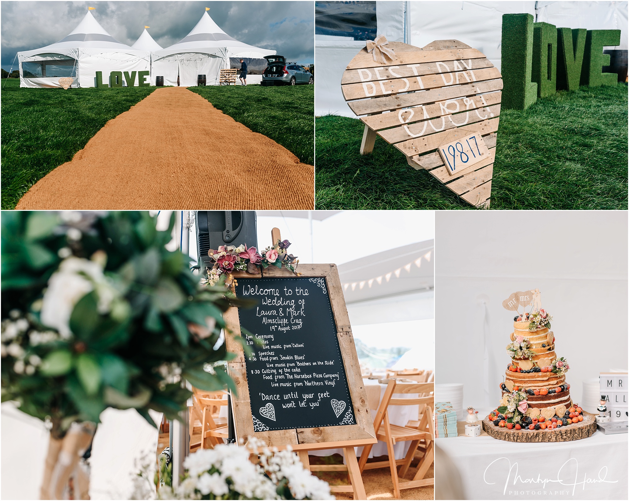 Deciding to plan their own day entirely, Laura and Mark hired a field next to Almscliffe Crag, a gritstone outcrop in North Rigton, on the way to Harrogate. The pair had often come here with their beautiful daughter Lydia to walk their lovable dog Busby and they decided that’s where they wanted their wedding to be held. No fancy reception venue or church, they wanted their own festival in a field and boy did they get it!!